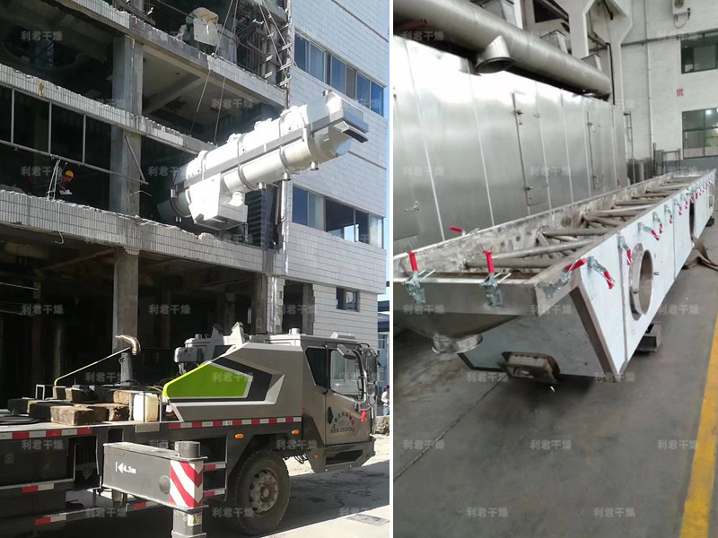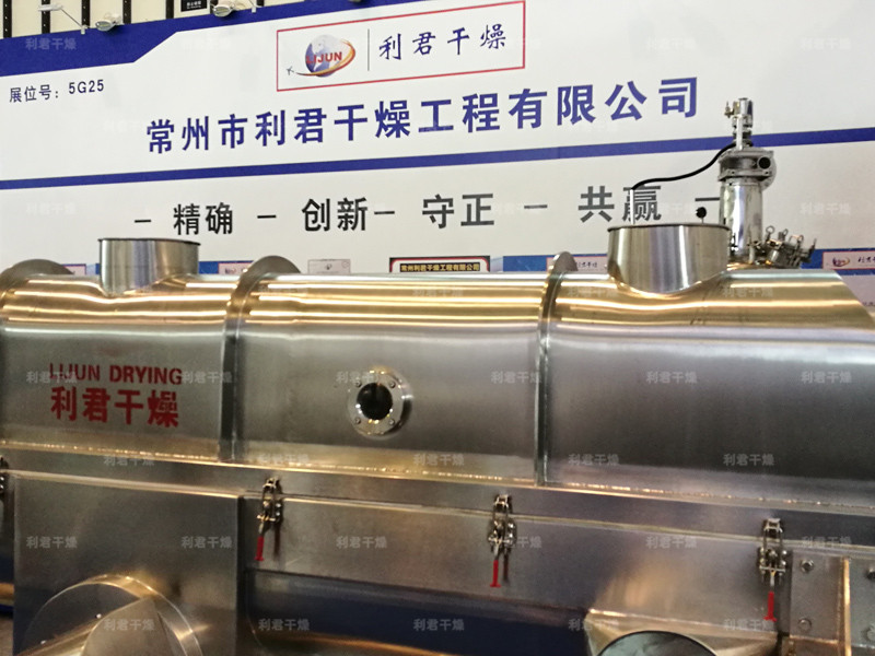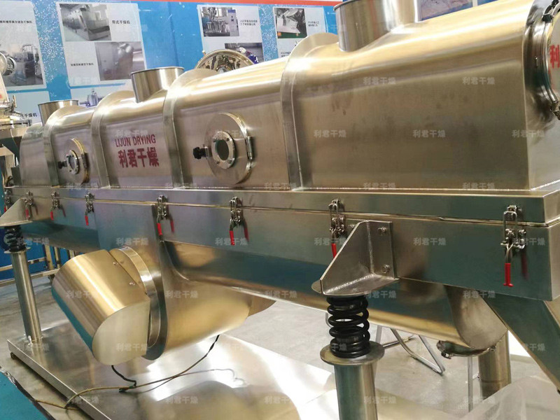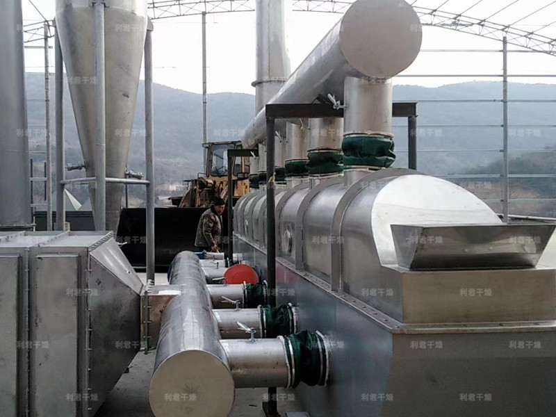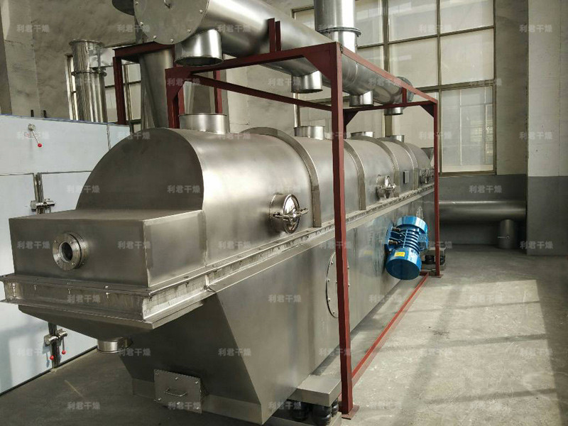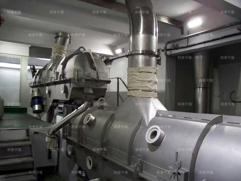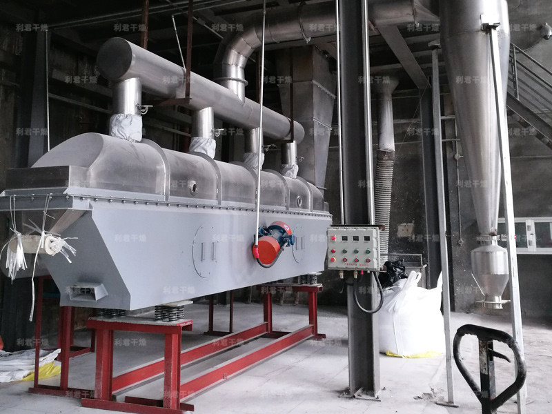 物料自進料進口進入機內,在振動力作用下,物料沿水平面流化床拋擲,向前連續運動,熱風向上穿過流化床同濕物料換熱后,濕空氣經旋風分離器除塵后由排風1:3排出,干燥物料由排料進口排出。