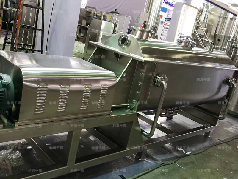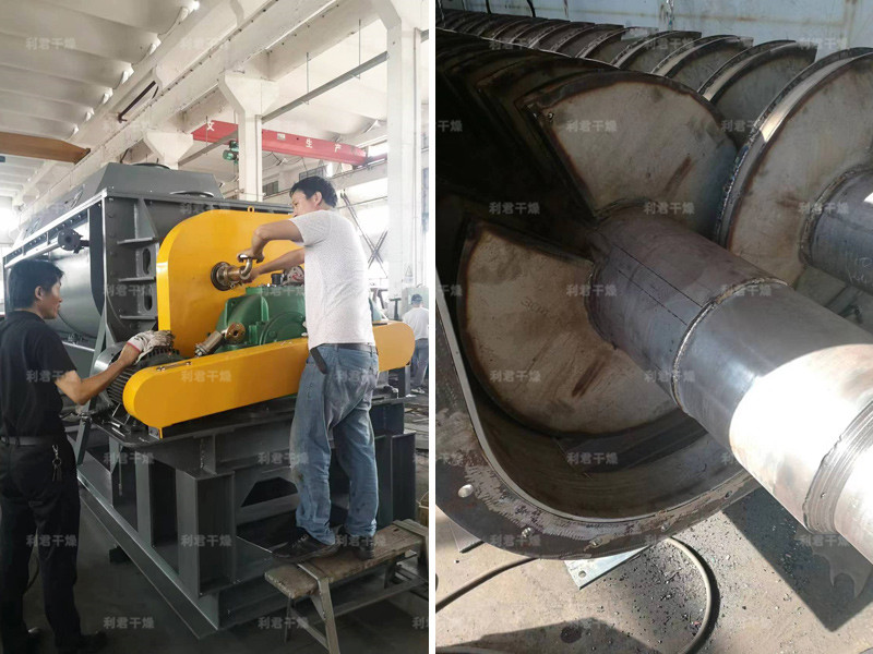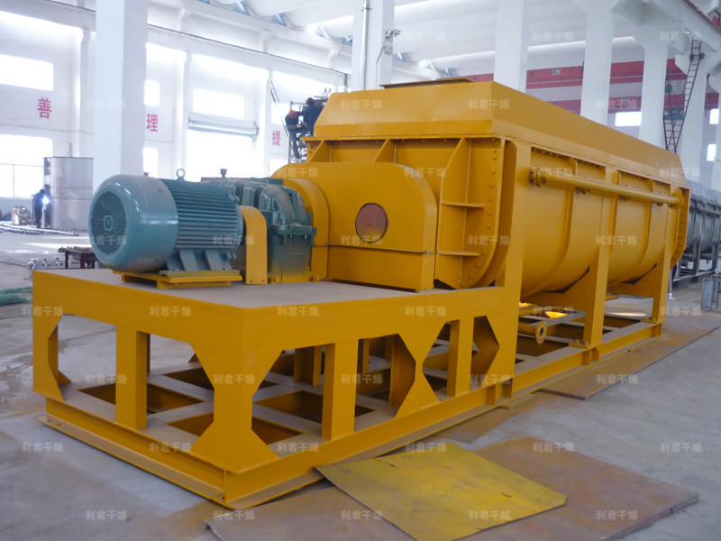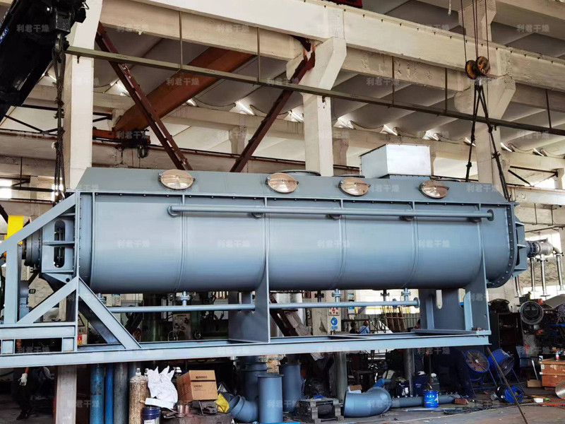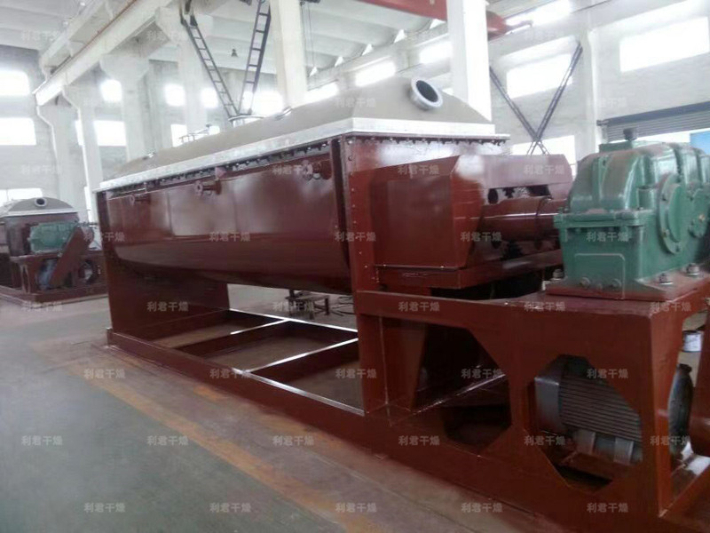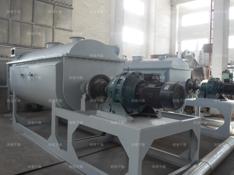 空心軸上密集排列著楔型中空漿葉,熱介質經空心軸流經漿葉。單位有效容積內傳熱面積很大,熱介質溫度從-40℃到320℃,可以是水蒸汽,也可以是液體型:如熱水、導熱油等。間接傳導加熱,沒有攜帶空氣帶走熱量,熱量均用來加熱物料。熱量損失僅為通過器體保溫層向環境的散熱。楔型漿葉傳熱面具有自清潔功能。物料顆粒與楔型面的相對運動產生洗刷作用,能夠洗刷掉楔型面上附著物料,使運轉中一直保持著清潔的傳熱面。漿葉干燥機的殼體為Ω型,殼體內一般安排二到四根空心攪拌軸。殼體有密封端蓋與上蓋,防止物料粉塵外泄而充分發揮作用。