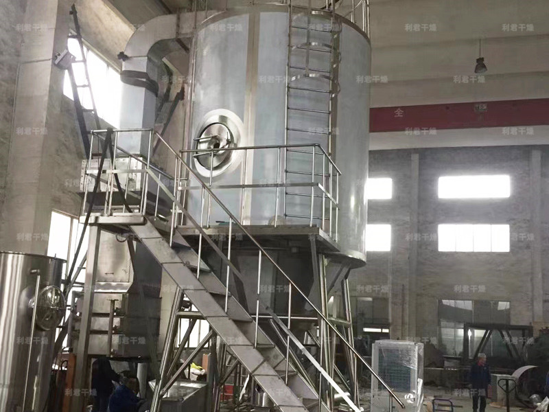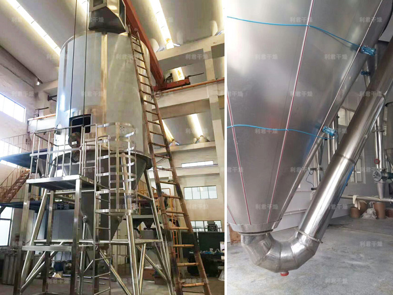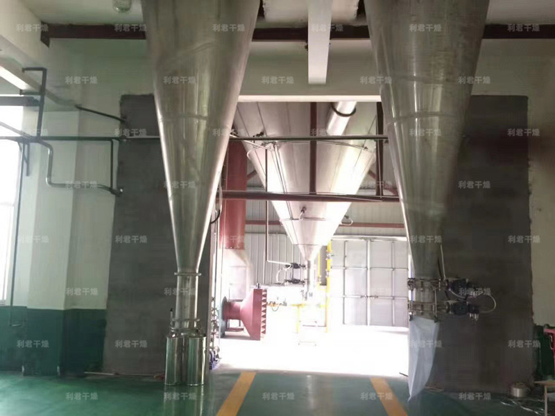 空氣經(jīng)過(guò)濾和加熱,進(jìn)入干燥器頂部空氣分配器,熱空氣呈螺旋狀均勻地進(jìn)入干燥室。料液經(jīng)塔體頂部的高速離心霧化器,(旋轉(zhuǎn))噴霧成極細(xì)微的霧狀液珠,與熱空氣并流接觸在極短的時(shí)間內(nèi)可干燥為成品。成品連續(xù)地由干燥塔底部和旋風(fēng)分離器中輸出,廢氣由風(fēng)機(jī)排空。