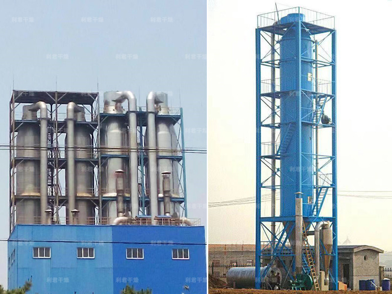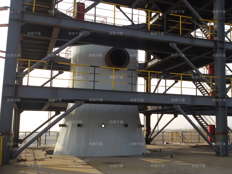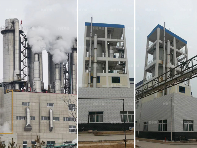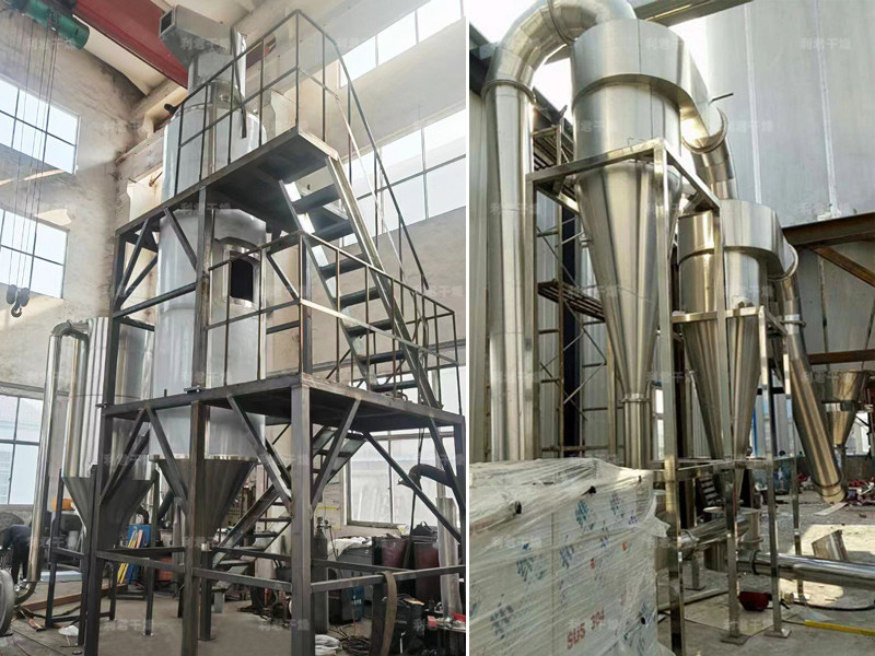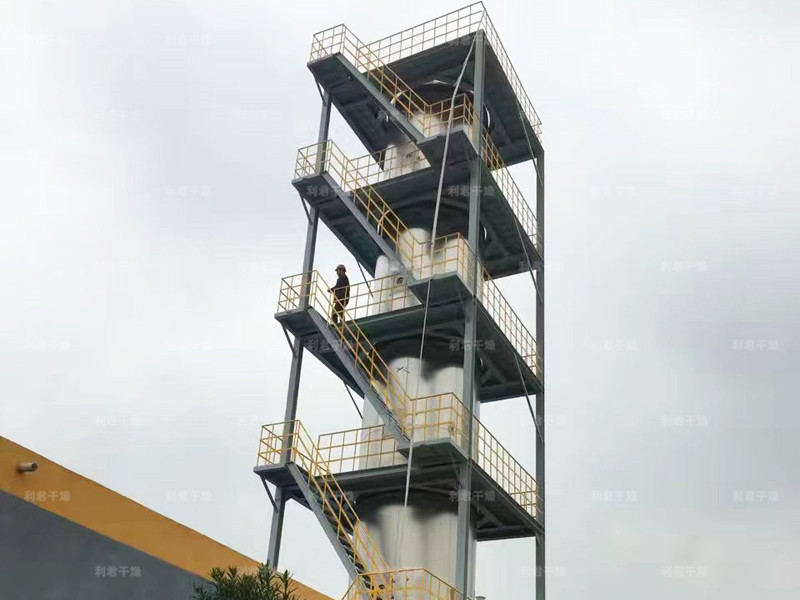 本機組工作過程為料液通過隔膜泵高壓輸入,噴出霧狀液滴,然后同熱空氣并流下降,大部分粉粒由塔底排料口收集,廢氣及其微小粉末經(jīng)旋風(fēng)分離器分離,廢氣由抽風(fēng)機排出,粉末由設(shè)在旋風(fēng)分離器下端的授粉筒收集,風(fēng)機出口還可裝備二級除塵裝置,回收率在96-98%以上。